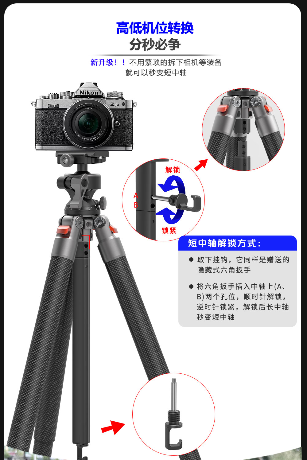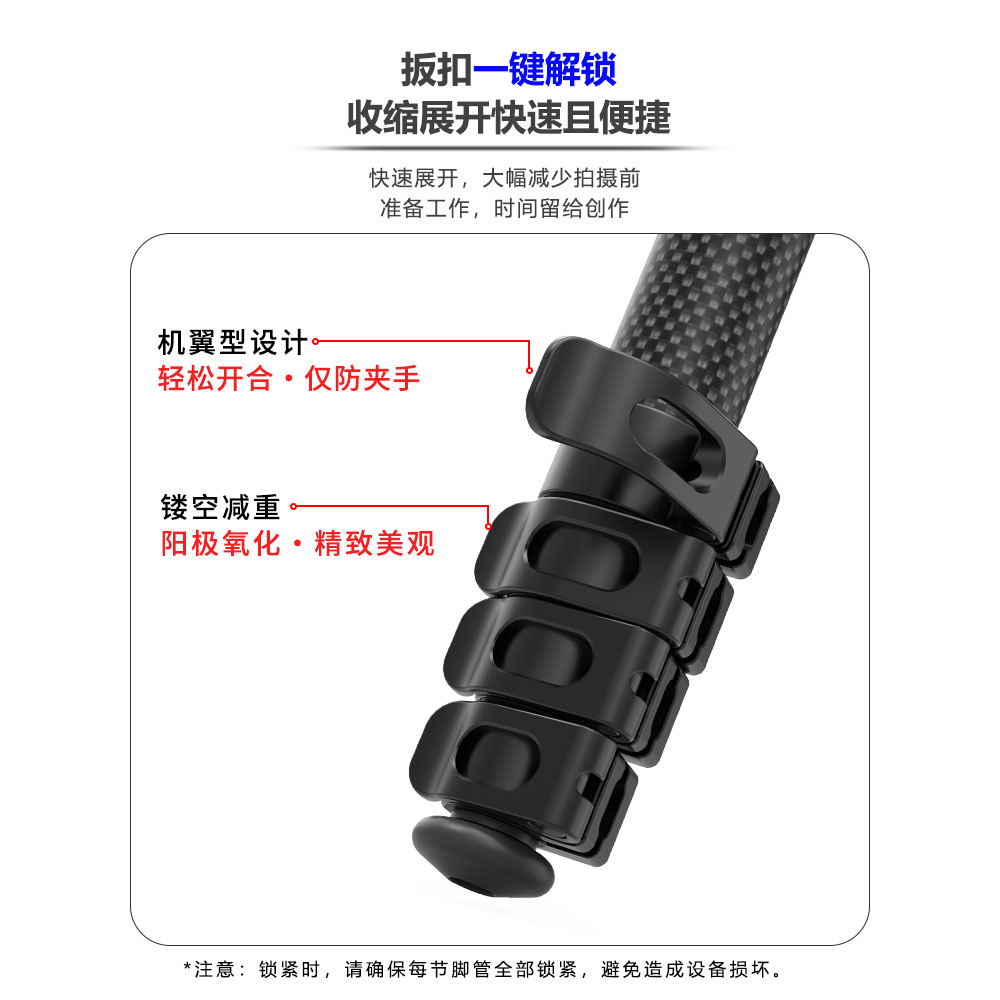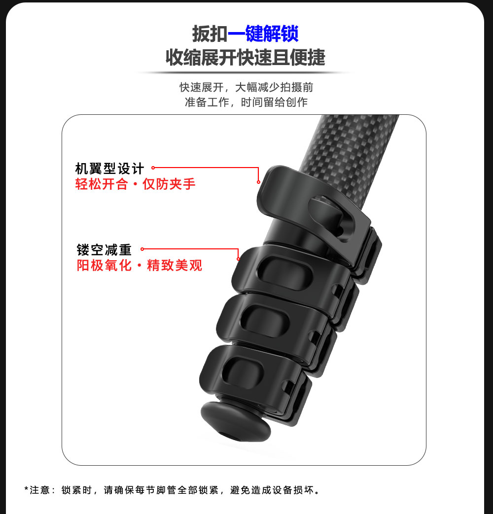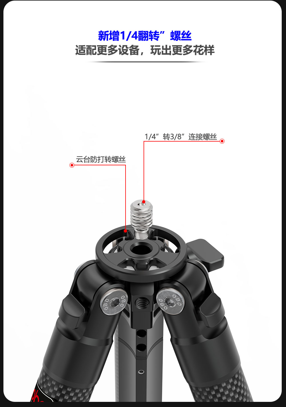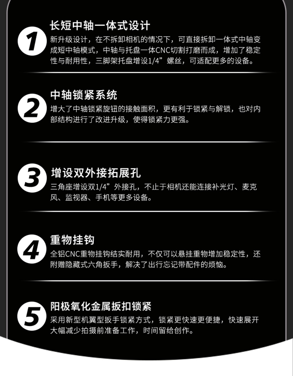 由3K碳纤维制作而成,内锁设计,托盘螺丝1/4"转3/8"翻转螺丝。中轴部分采用三角凹面及长短中轴一体式的设计风格,减小收纳空间。可在拍摄过程中,完成短中轴的拆卸和安装。三角座部分减重孔设计且结构紧凑,双1/4”外部接口,轻松满足多机位拍摄的需求,也可外接补光,录音,魔术手等设备。三个档位调节带有自动回弹系统,全新扳扣锁紧系统,锁紧力强,稳定性好,重量轻,操作便携快速。