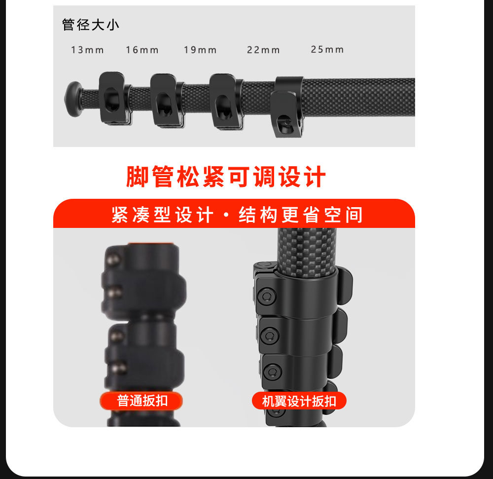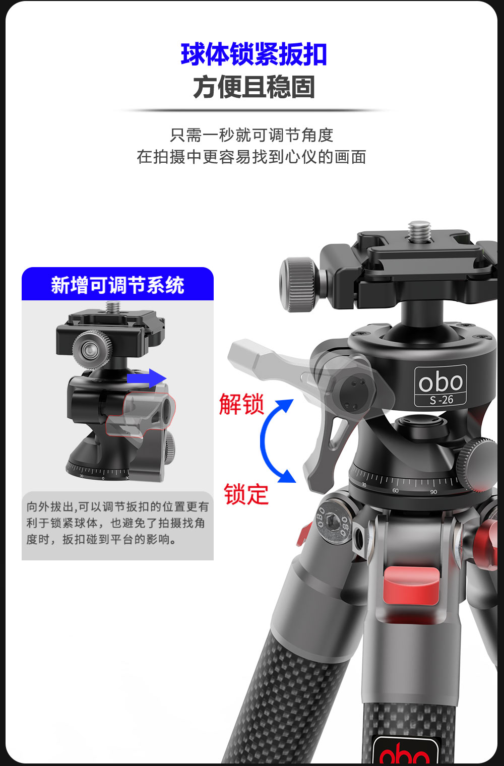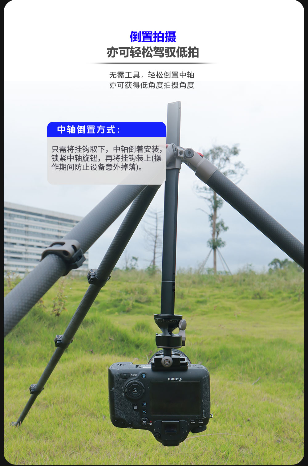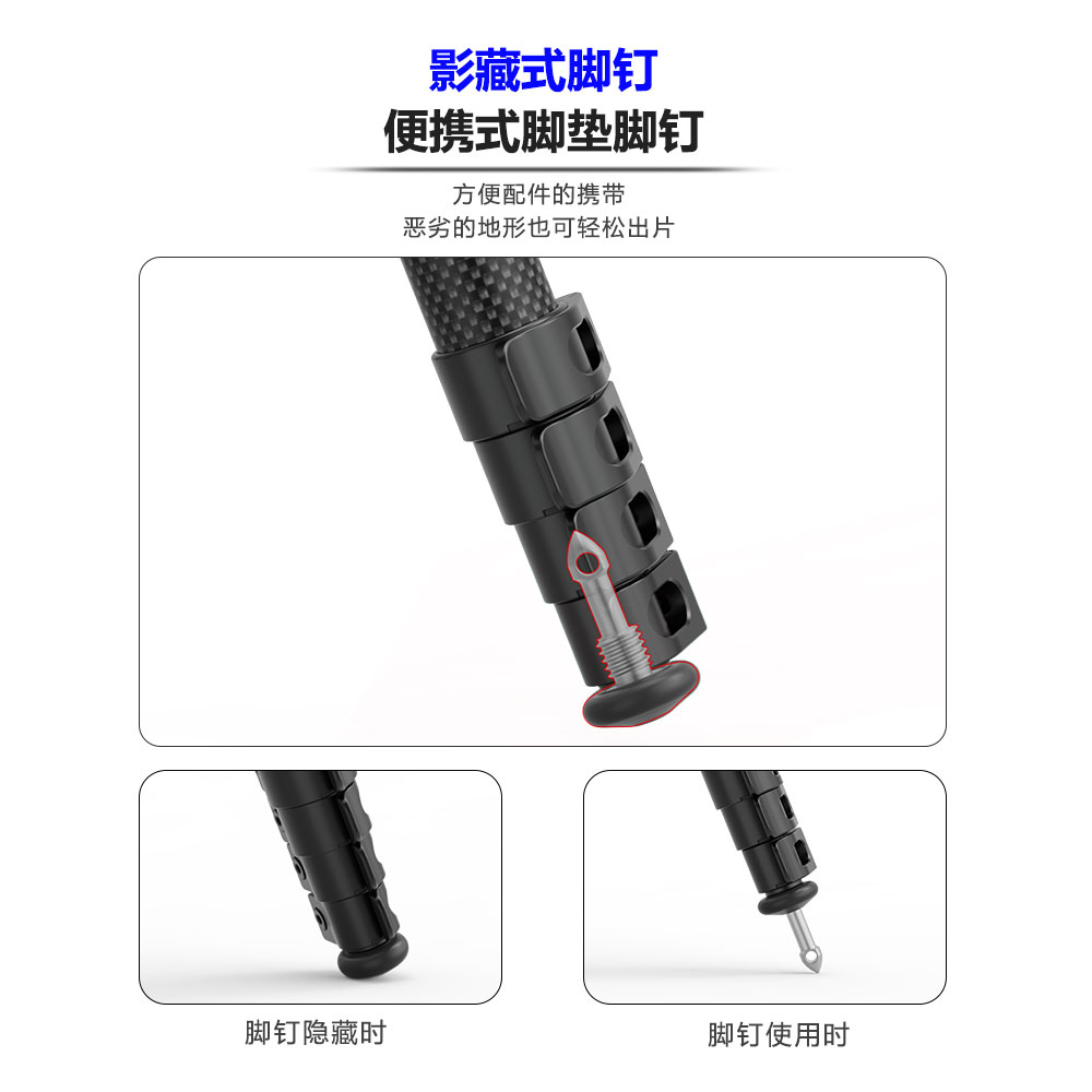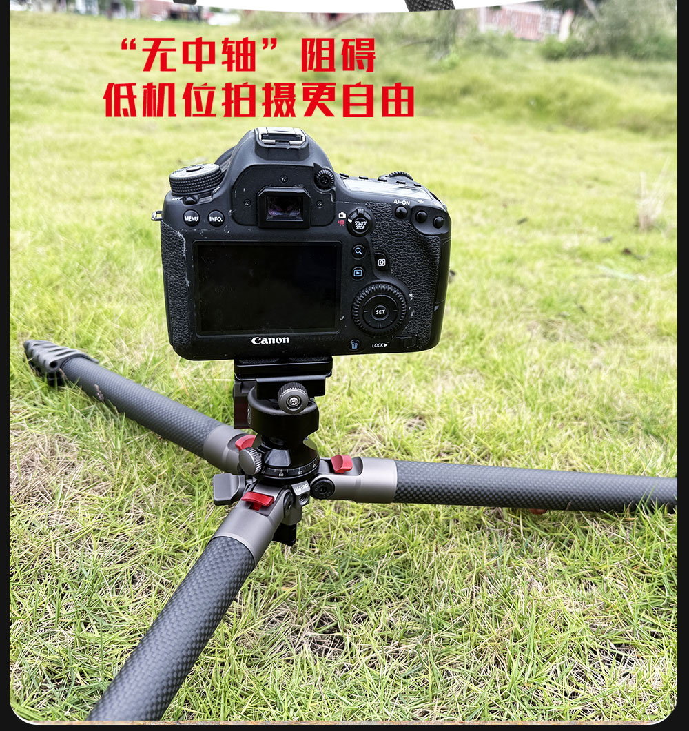 由3K碳纤维制作而成,内锁设计,托盘螺丝1/4"转3/8"翻转螺丝。中轴部分采用三角凹面及长短中轴一体式的设计风格,减小收纳空间。可在拍摄过程中,完成短中轴的拆卸和安装。三角座部分减重孔设计且结构紧凑,双1/4”外部接口,轻松满足多机位拍摄的需求,也可外接补光,录音,魔术手等设备。三个档位调节带有自动回弹系统,全新扳扣锁紧系统,锁紧力强,稳定性好,重量轻,操作便携快速。