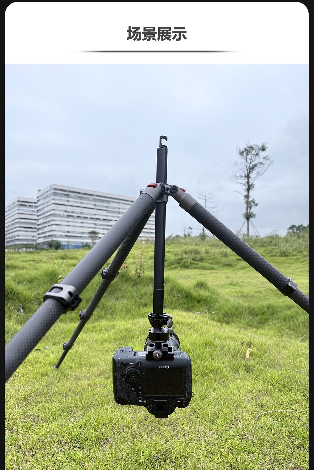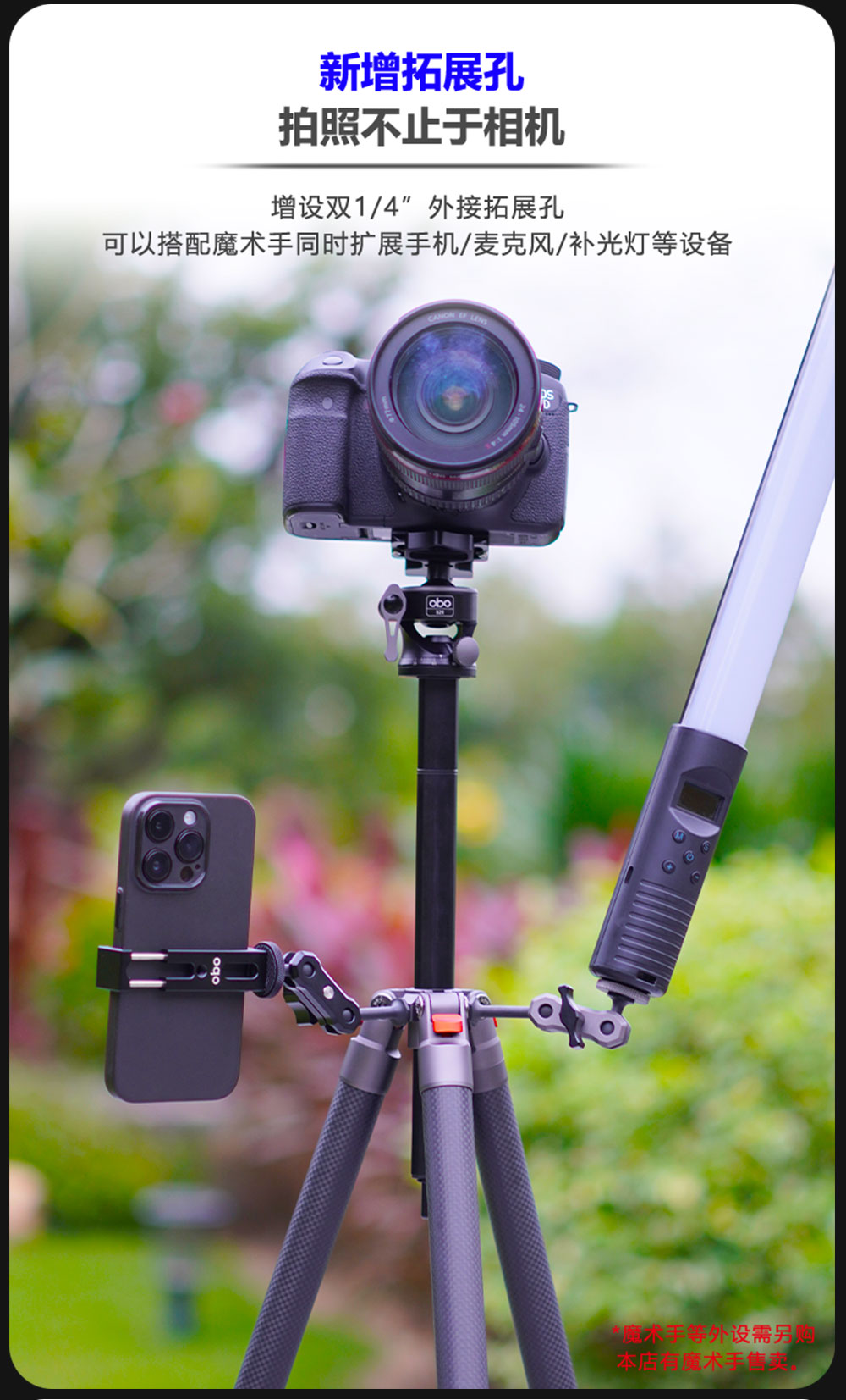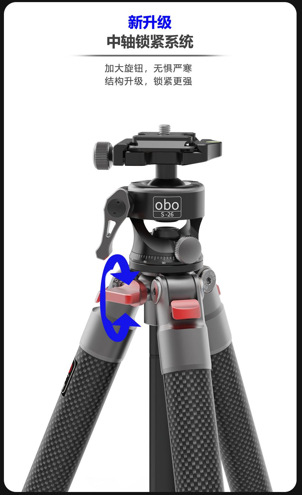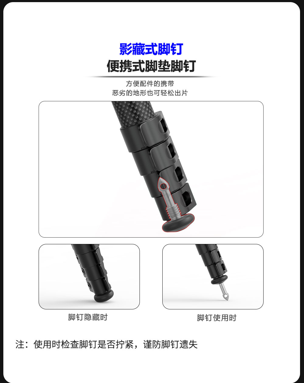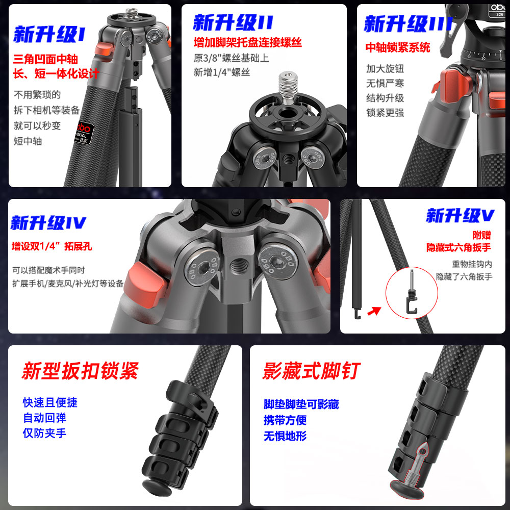由3K碳纤维制作而成,内锁设计,托盘螺丝1/4"转3/8"翻转螺丝。中轴部分采用三角凹面及长短中轴一体式的设计风格,减小收纳空间。可在拍摄过程中,完成短中轴的拆卸和安装。三角座部分减重孔设计且结构紧凑,双1/4”外部接口,轻松满足多机位拍摄的需求,也可外接补光,录音,魔术手等设备。三个档位调节带有自动回弹系统,全新扳扣锁紧系统,锁紧力强,稳定性好,重量轻,操作便携快速。