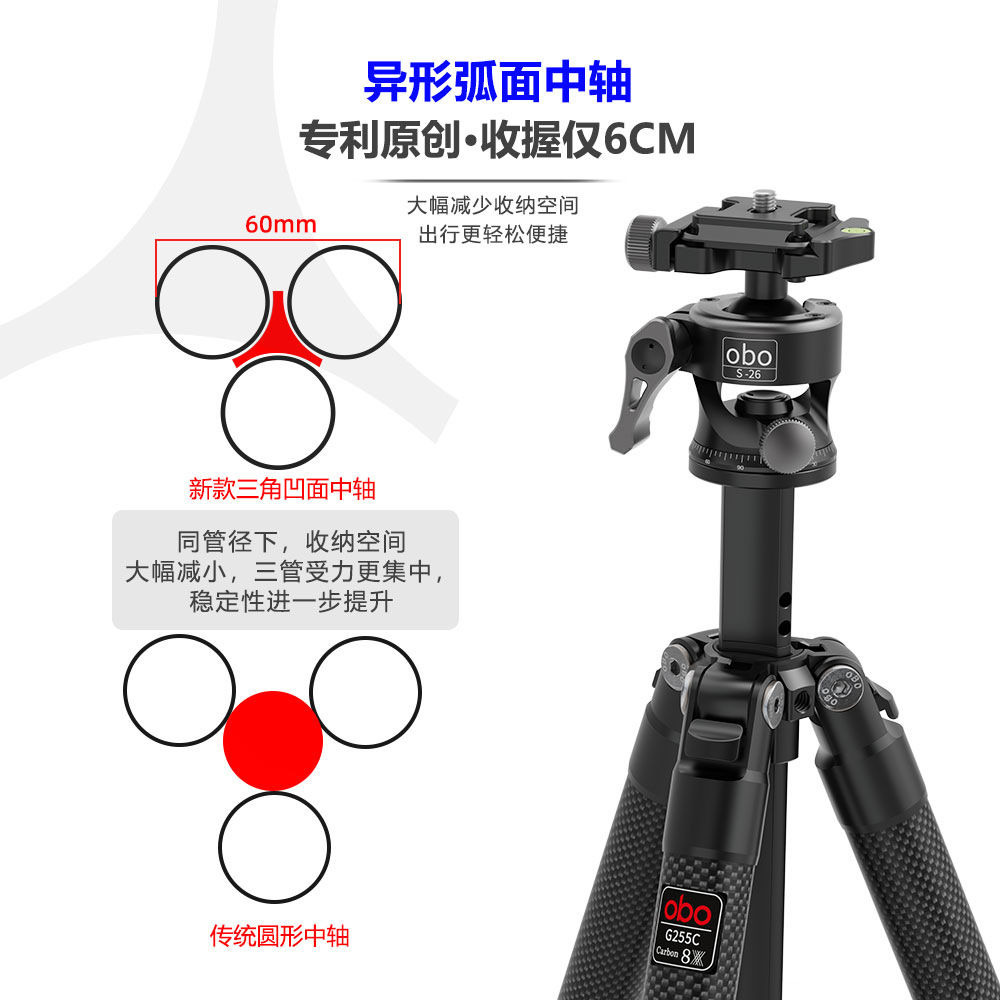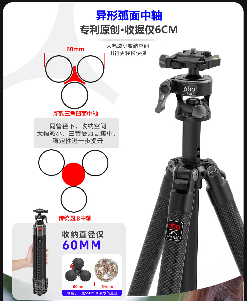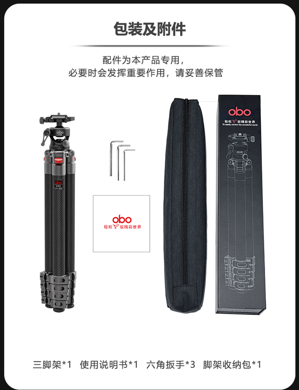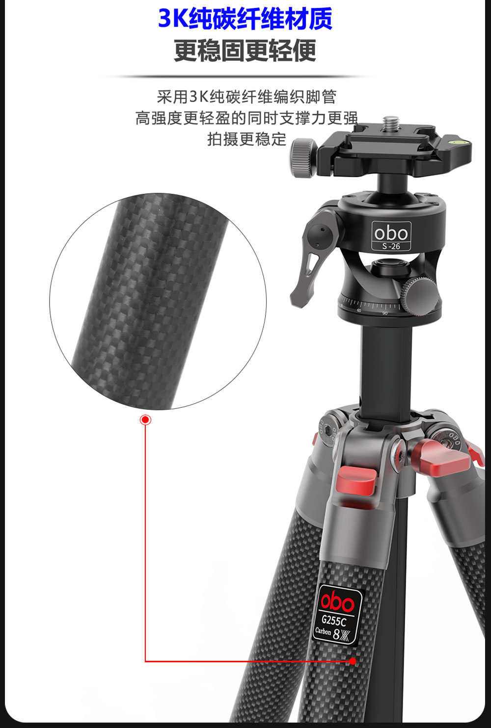 由3K碳纤维制作而成,内锁设计,托盘螺丝1/4"转3/8"翻转螺丝。中轴部分采用三角凹面及长短中轴一体式的设计风格,减小收纳空间。可在拍摄过程中,完成短中轴的拆卸和安装。三角座部分减重孔设计且结构紧凑,双1/4”外部接口,轻松满足多机位拍摄的需求,也可外接补光,录音,魔术手等设备。三个档位调节带有自动回弹系统,全新扳扣锁紧系统,锁紧力强,稳定性好,重量轻,操作便携快速。
